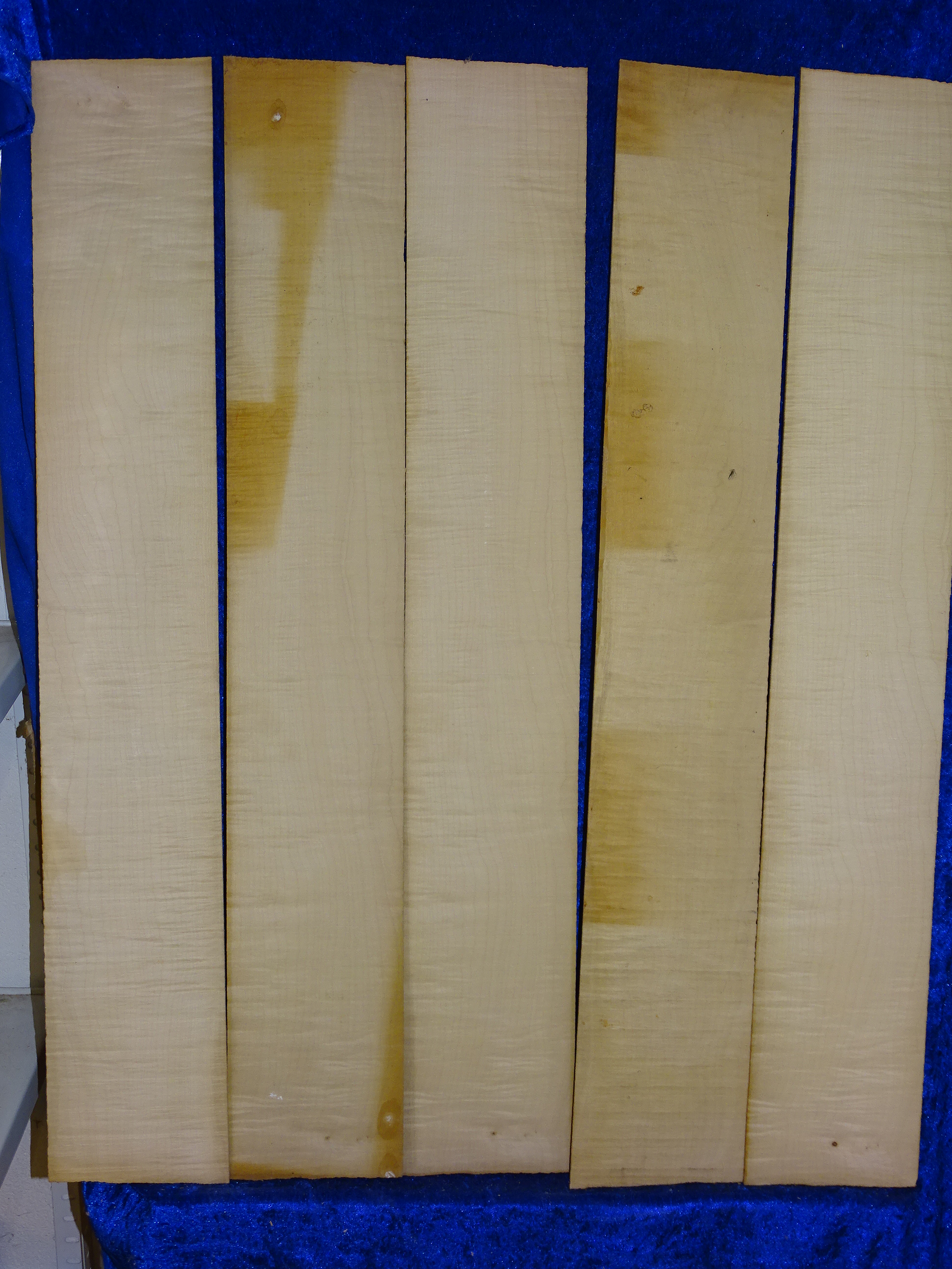 From estate: Beautiful flamed bosnian?? cello ribs, semi-tangential, narrow years, from high area, minimum 20 years old, approx. 85 cm x 13,7 cm x 0,2 cm (5 pieces ) Best cutting for violin! Excellent piece for master!!!! not planed!!