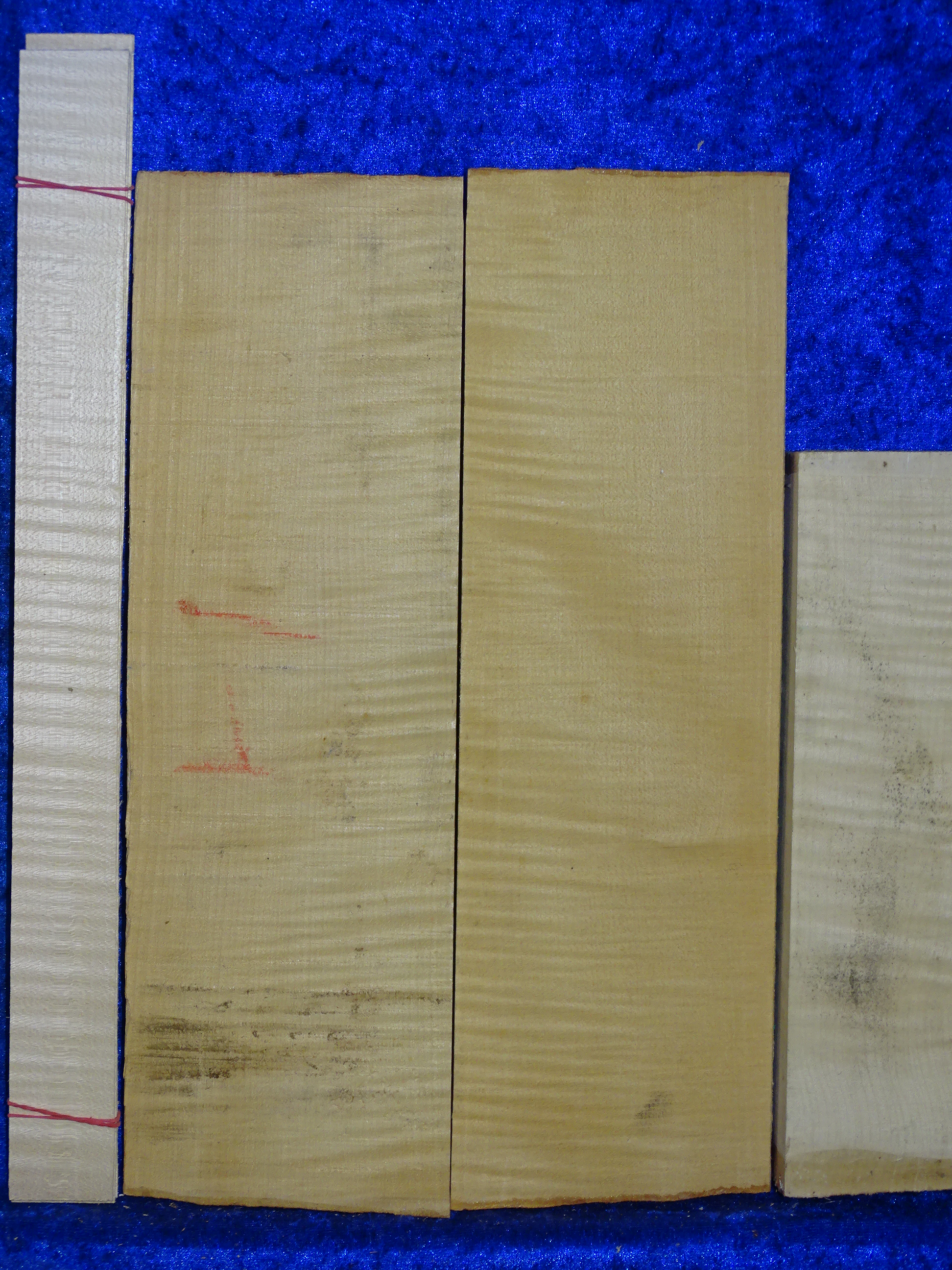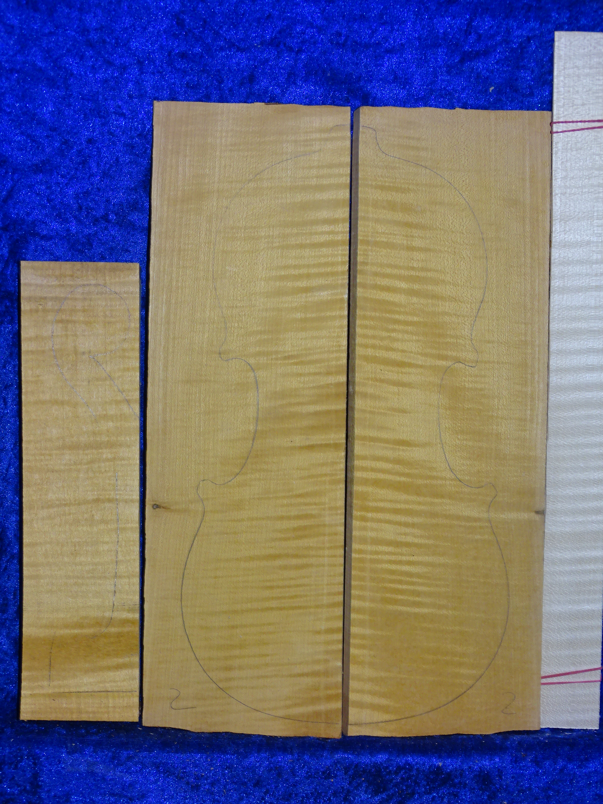 Very nice flamed bosnian maple for 4/4 violin, approx. each 39,5 cm x 12,5 cm x 2,2 - 1 cm, very narrow years, from high area, best cutting for violin! From 2003, very nice wood!!! with matching neck block and ribs